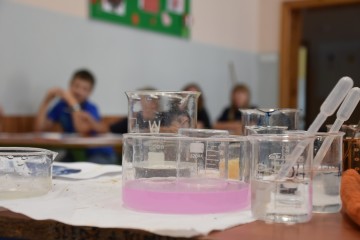 Malować bez farb? Czy to możliwe? Na stole leżą: menzurka, pipeta i kilka szklanych pojemników z różnobarwnymi płynami, ale nie farbami. Dorośli są ubrani w białe fartuchy, mają okulary na oczach, a grupa dzieci skupiona jest wokół nich. Tak wyglądała pierwsza część dzisiejszego spotkania uczestników warsztatów z cyklu Badacze i odkrywcy. Dzieci uczestniczące w zajęciach mogły się przekonać, że nie mając farb plakatowych, ani choćby akwareli można malować.