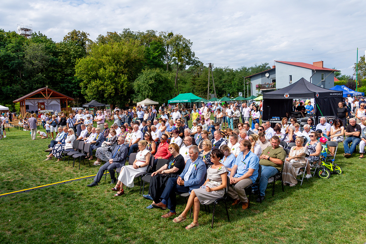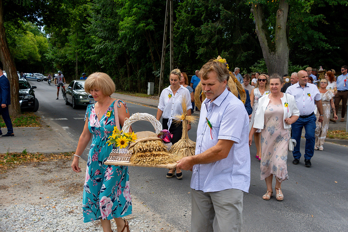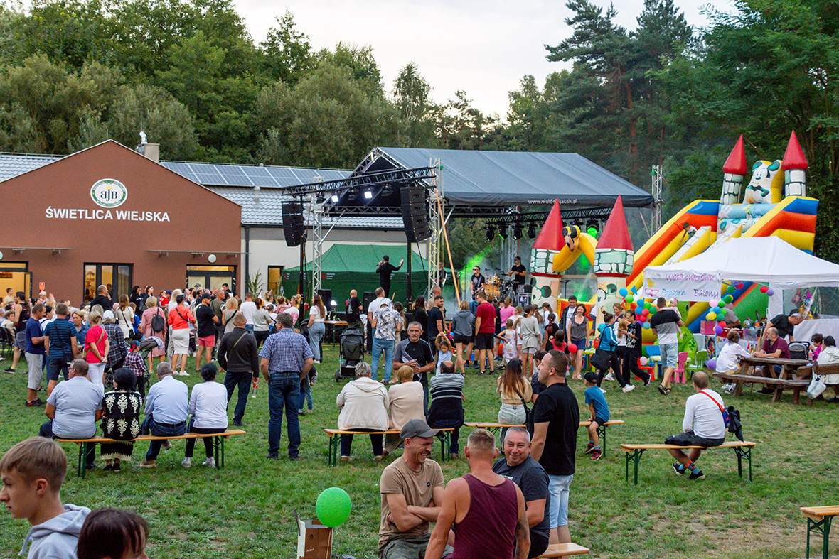 W niedzielne popołudnie był i czas na zabawę. Dzieci cieszyły się, ogromną zjeżdżalnią i wielkimi puzzlami z wizerunkami zwierząt z polskich lasów. O takiej atrakcji pomyśleli myśliwi z Koła Łowieckiego „Czajka”. Na stoisku Koła Gospodyń Wiejskich z Biskupic można było zobaczyć też zwierzęta, tyle że wykonane na drukarce 3D. W trakcie dożynkowego festynu pszczelarze prezentowali miody, pszczelą węzę i narzędzia do pracy przy ulach. Licznie reprezentowane było również lokalne rękodzieło, na przykład prace z drewna pozyskanego z remontowanego budynku, czy efekty szydełkowania. Uczestników dożynek zabawiał piosenkami z różnych regionów Europy, od Śląska po Tyrol, Artur Kwaśnica. Bardziej nastrojowo zrobiło się, gdy na scenie pojawił się Duet Romantica, a gdy na scenie stanął zespół „Ogień”, zrobiło się wręcz gorąco.
