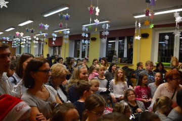 Tego dnia zrobiło się u nas kolorowo, gwarno i wesoło. Aula wypełniła się ludźmi. Poszczególne klasy przygotowały świąteczne stoiska, na których pojawiły się cuda i cudeńka. Stoły aż uginały się od ciężaru różnorodności. Niektórzy wykorzystali czas podczas kiermaszu na zakup świątecznych prezentów. Można było wypatrzeć anioły ręcznie robione ze sznurka lub masy solnej. Przyciągały oko szyte specjalnie na tę okazję poduchy. Na kiermaszu nie zabrakło pierników, lampionów, kartek świątecznych, wykonanych przez dzieci i rodziców. Na scenie Mikołaje zajmowały się licytacją stroików. Ile tam było emocji!!! Nieważna cena, ale to oczekiwanie, kto kogo przebije i za ile stroik zostanie sprzedany. Wielkim zainteresowaniem cieszył się „szczęśliwy numerek”. Można było wylosować nagrodę. Ale nie to było najistotniejsze, najważniejszy był cel, a przy okazji dobra zabawa. Naprawdę warto było. Spacerując pośród stoisk świątecznych można było uraczyć się pysznym ciastem i kawą. W sali językowej odbywały się warsztaty plastyczne, składano serwetki, klejono bombki, natomiast w sali gimnastycznej strzelano z łuku. Wszyscy się doskonale bawiliśmy.